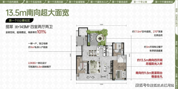建面约143-217㎡空中大平院,户户空中花园,私家庭院设计,将自然与生活完美融合;社区打造品牌联名泛会所,为爸爸、妈妈、小孩打造各自的专属活动空间,同时配备高奢双大堂、艺术光厅车库,提升居住质感。
