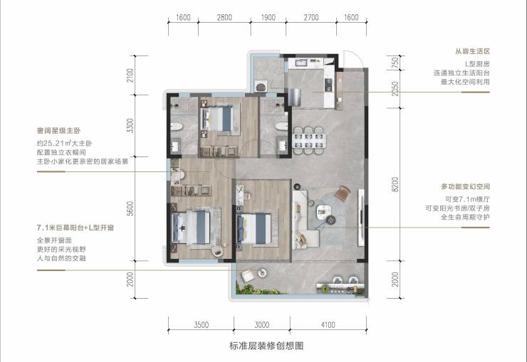 中空low-e封窗交付|动静分区|星级主卧|7.1米巨幕阳台|L型开窗面|创意灵动户型