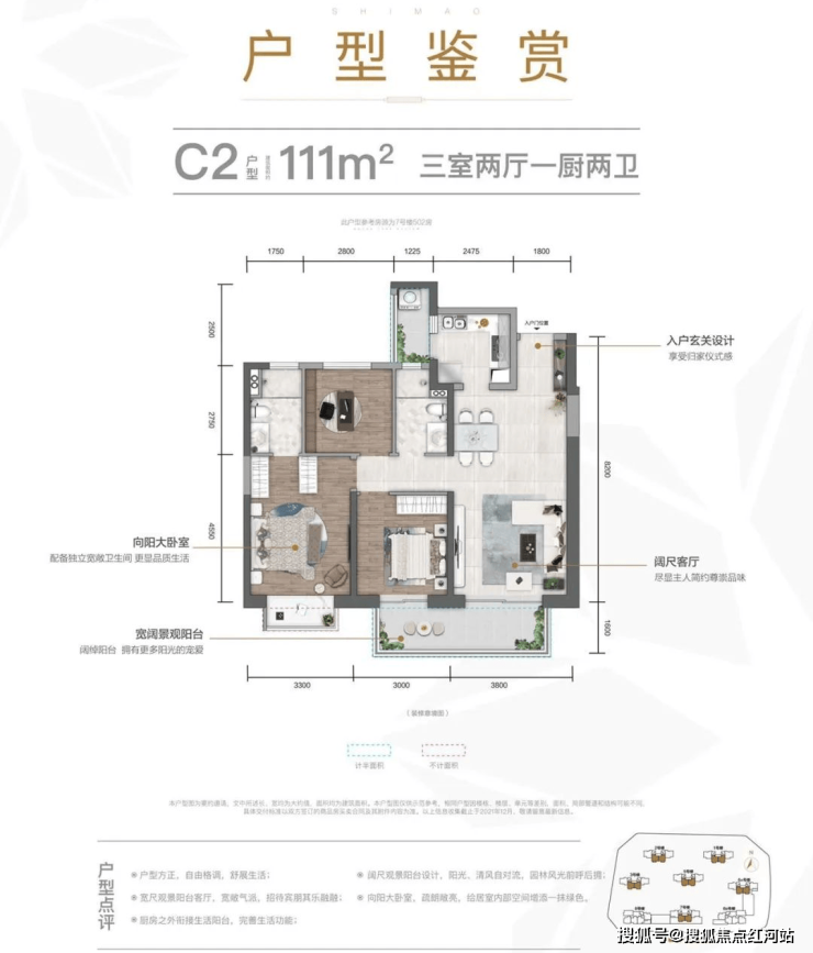 建面约 111㎡ 三室两厅两卫:户型方正,南北通透,2 梯 4 户低公摊,客厅连接观景阳台,主卧套房设计,私密性强;