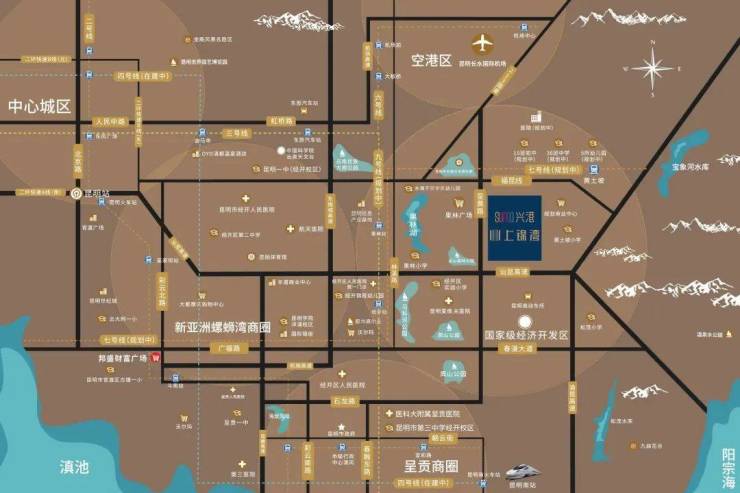 两横两纵的立体交通网络,横向的昆石高速、春漫大道向西直通昆明主城中心区。纵向渝昆高速、经开区主轴石龙路(呈黄线),周边还规划了地铁7号线(黄土坡站)及9号线(经开站);未来整个片区将形成高速公路、轻轨、城市快速干道为一体的立体交通网络,极速通达全城。