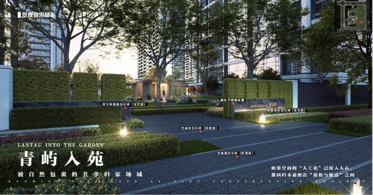 东大门入户从公园里归家(东边规划约4000方市政景观公园),采用高绿篱及氛围灯饰形成被自然包裹的归家场域,给人一种温馨而又高级的居住环境。