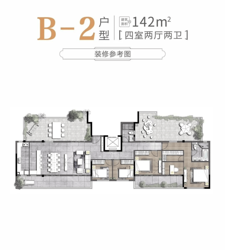 B户型顶层,四室两厅两卫,建筑面积约142㎡,实得280㎡+