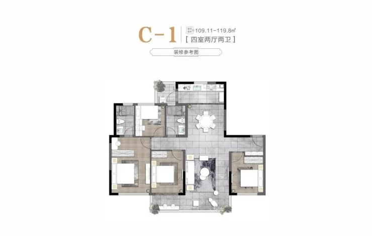 C-1户型,四室两厅两卫,建筑面积约109.11-119.8㎡,实得130㎡