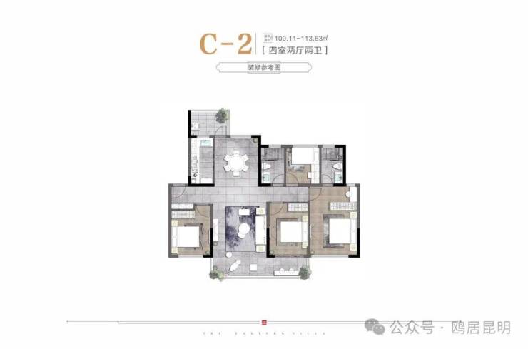 C-2户型,四室两厅两卫,建筑面积约109.11-113.63㎡,实得130㎡
