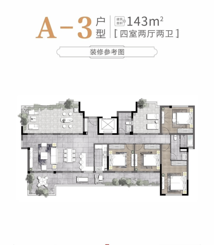A户型顶层,四室两厅两卫,建筑面积约143㎡,实得280㎡+