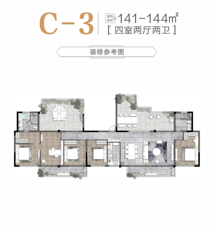 C户型顶层,四室两厅两卫,建筑面积约141㎡,实得280㎡+
