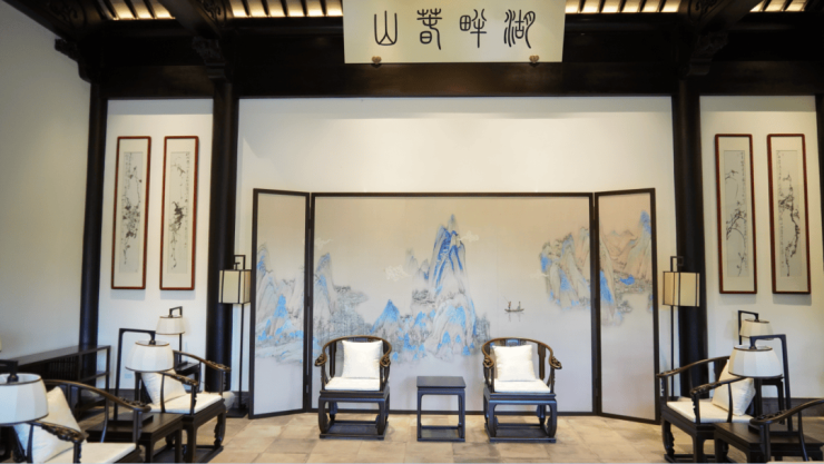 建筑是一种媒介,使人感受自然的存在。灰瓦粉墙、围合布局、前庭后院、木色凸花窗、中式屋檐、中式宅院门第、镶铜雕花木门、以及抱鼓石和砖雕等