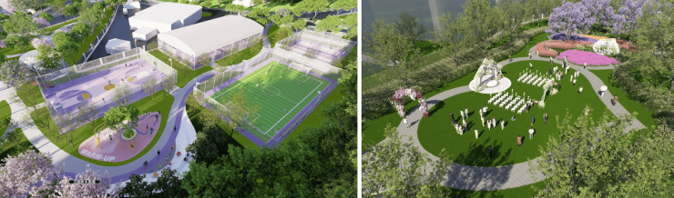 3万㎡运动区:篮球场、五人足球场、羽毛球场、板式网球场,搭配咖啡厅、星空草坪,运动社交两不误。
