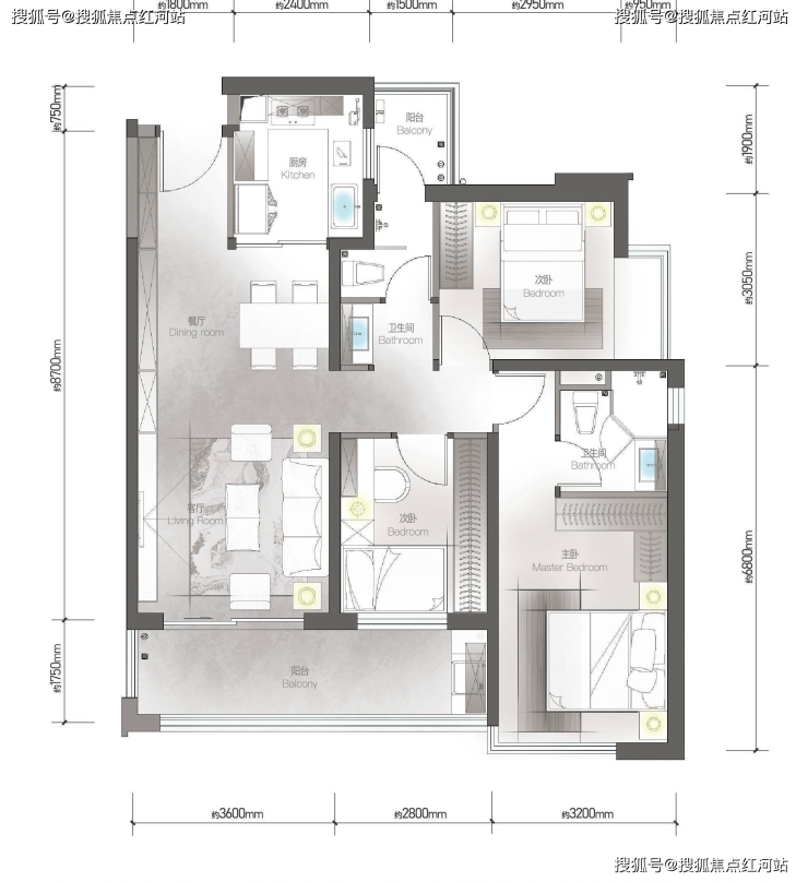 三开间采光,大约6.8米大的阳台,广角视野无边无际,空间动静分区相互干扰。