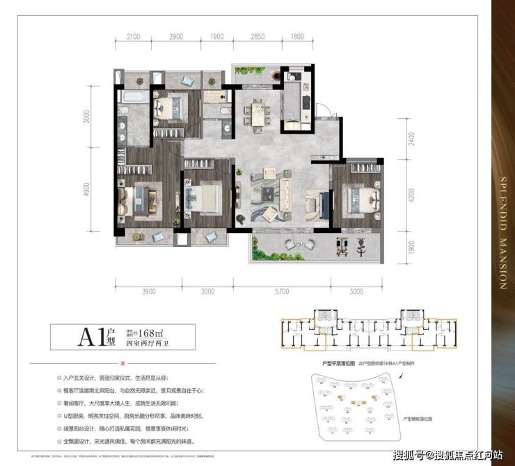A1户型:建筑面积约168㎡,四室两厅两卫