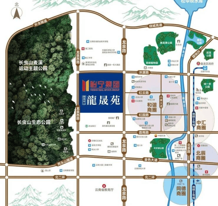 项目坐拥约3300亩长虫山生态公园,尽享纯天然负氧离子氧吧,周边有五大主题公园环绕(长虫山运动公园、昆明市植物园、黑龙潭公园、麦溪运动主题公园、月牙潭公园),北市区的城市绿肺,让您的生活每天都充满了绿色。