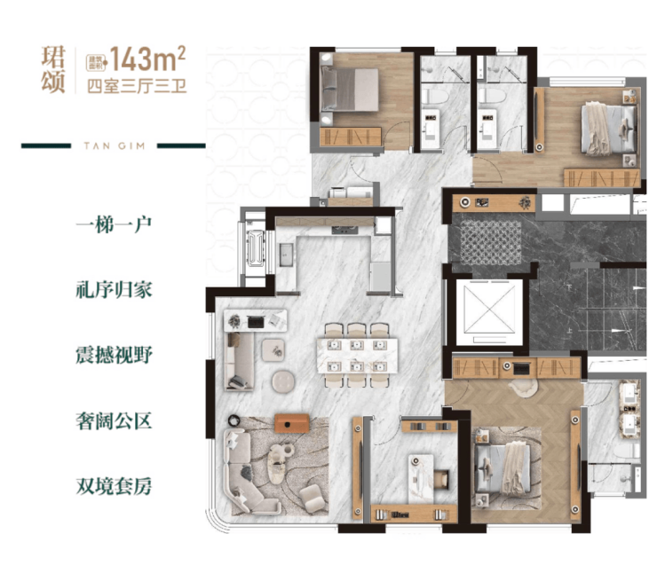 以40%超高绿地率,腾出更多的绿地面积,匠呈一心两轴四宴六境的山上人文园林景观,呈现出精雕细琢般的海派假日生活方式,缔造国贸芯一幅心灵“桃花源”的绝美画卷。