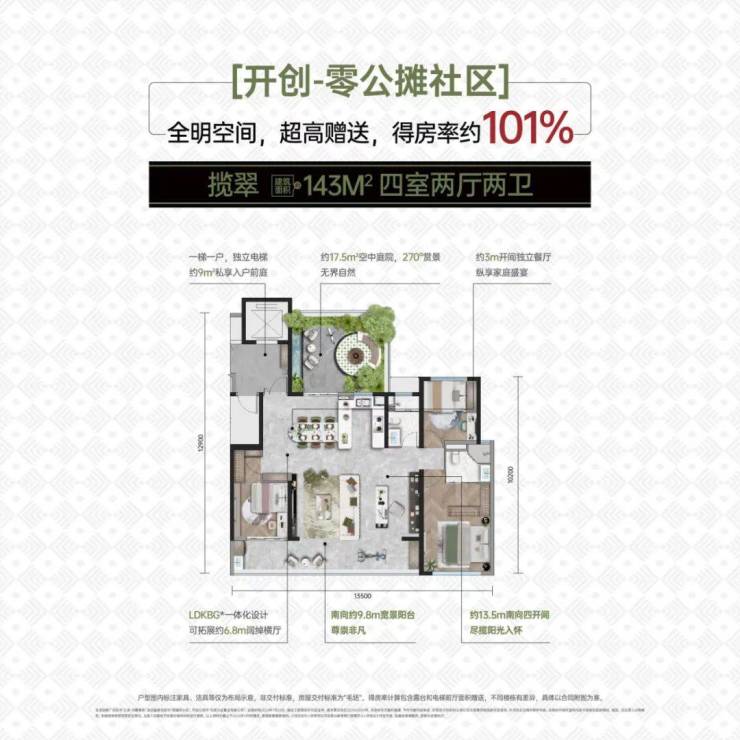 143㎡户型,得房率约101%,1T1户独立电梯入户,电梯前室9㎡空间,厨房开间面3米,面积全赠送的露台约15-18㎡,四开间朝南,阳台开间9.8米,连通双卧室和客厅。