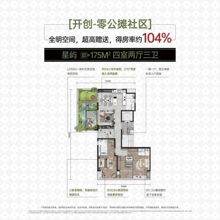 175㎡户型,得房率约104%,同样1T1独立电梯入户,客餐厅一体设计,开间7.2米,横厅设计,三开间朝南,南向阳台总宽10.8米,这个户型是双套房设计,对于三代同堂的家庭来说,非常适合。