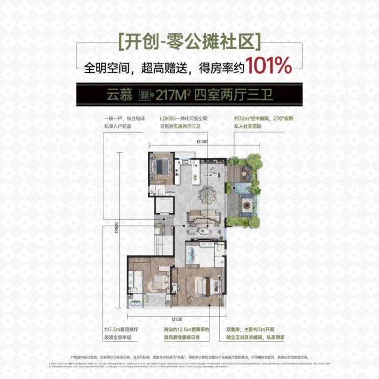 217㎡户型,得房率约101%,客餐厅开间7.2米,老人房尺寸3.9*3.2米,空间尺寸支持自定义改造为其他功能间,主卧和儿童房为双套房设计,三开间朝南,南向阳台总宽约12.5米。主卧开间约7米,可以说主卧比别人家的客厅还宽。