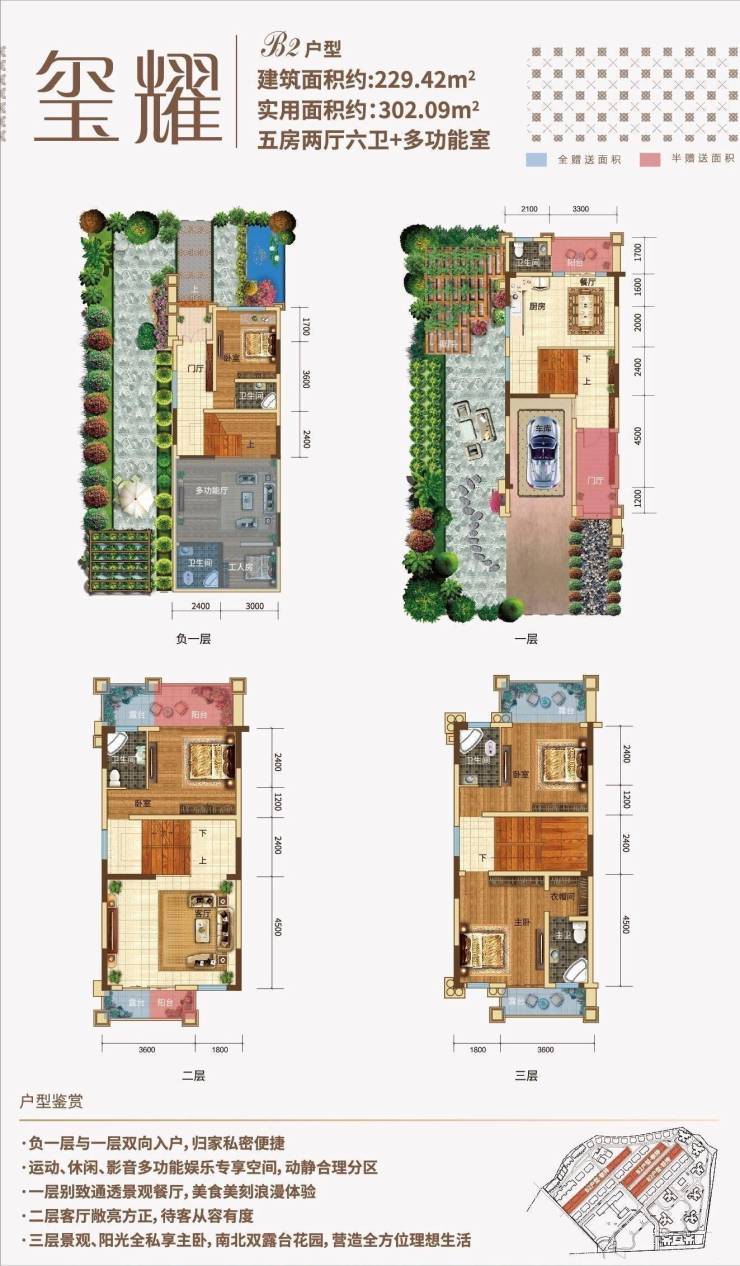 目前市面上少有的双拼产品,除了前后花园外,带有电梯入户,同样是地下1层地上3层的结构,户型面积290㎡,地下室赠送约45㎡,露台阳台赠送约61㎡,前后花园赠送面积约220㎡。
