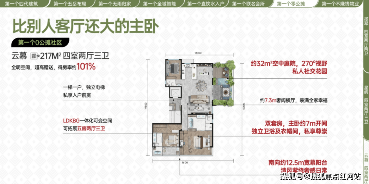 项目主推四款纯改善四房户型,全系0公摊、户户空中庭院,每一款都经过精心打磨,兼顾空间尺度、实用性与舒适度,适配不同改善家庭需求,具体亮点如下: