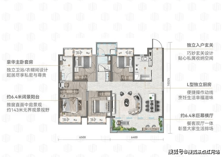 135㎡四房两厅两卫:阔绰尺度,正对中庭园林,仅此64席,1梯2户纯板式设计,约5.8米横厅比肩大平层居住体验,适合三代同堂长期居住,尽显家的温馨与阔绰。