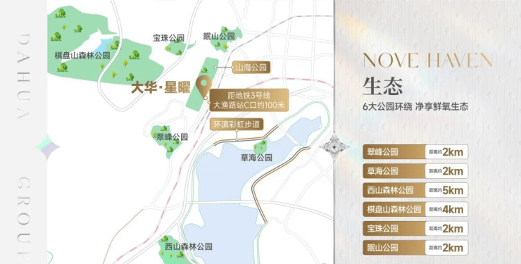 翠峰公园、草海公园、西山森林公园、棋盘山森林公园、宝珠公园、眠山公园六大生态公园环伺。