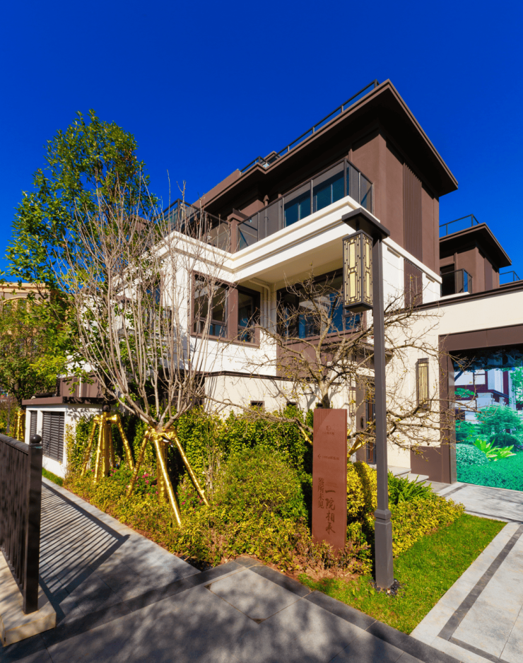 阔景入园:47米宽,5.7米高新中式入园大门,白色石砖与咖色金属搭配塑造现代中式大气磅礴的尊贵入户体验。