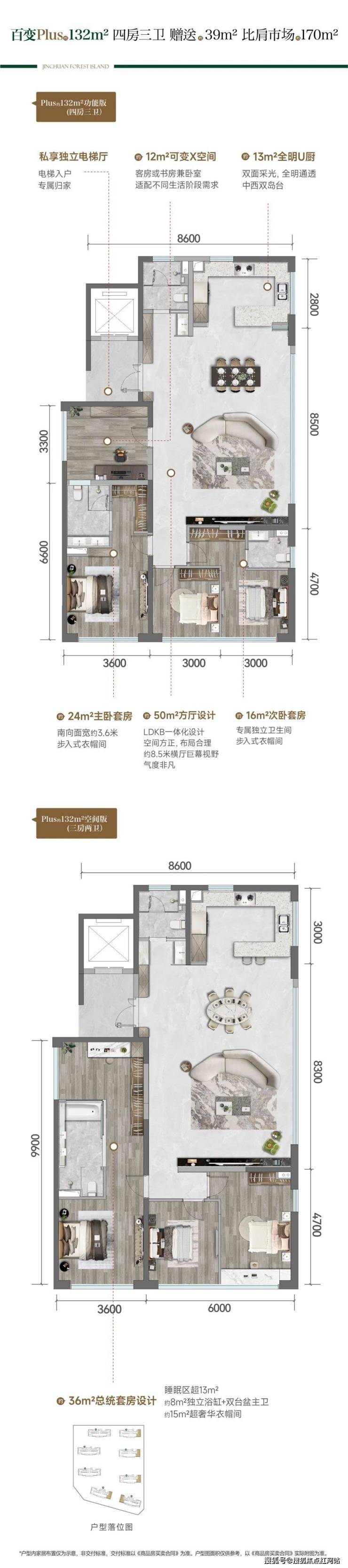百变 Plus132㎡:四房三卫双套房设计,独立电梯厅入户,约 132㎡坐拥约 170㎡阔境,8.5 米横厅打造圈层社交主场;