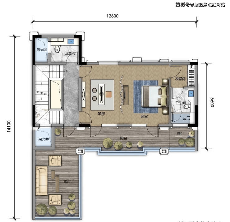 C1 建面约330㎡,露台面积约48㎡,可拓展最大面积约492㎡