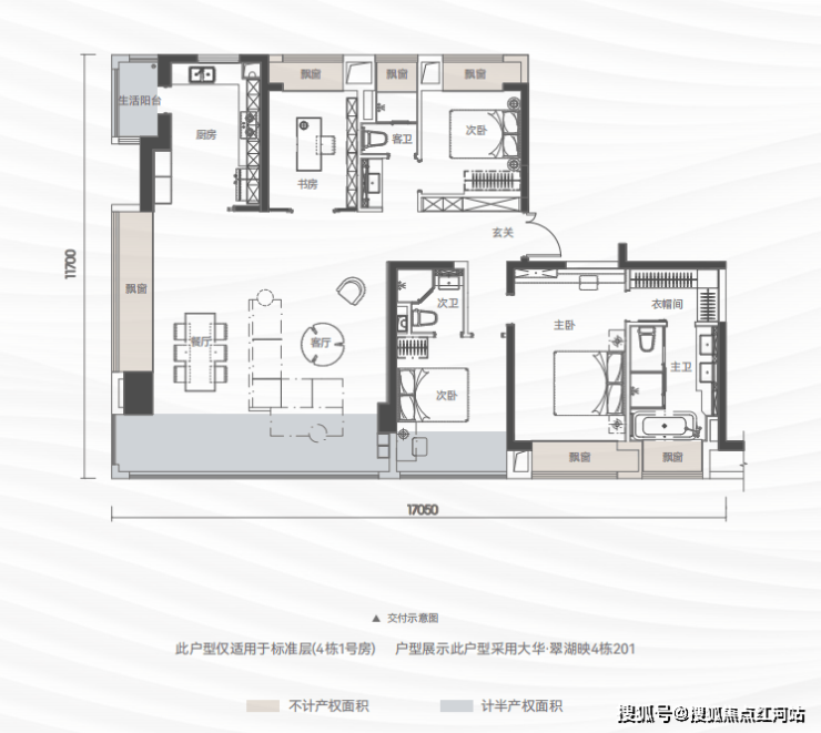 182㎡四房两厅两卫:仅有 22 席,约 6 米南向横厅,双阳台设计,四开间朝南,全屋采光均衡;