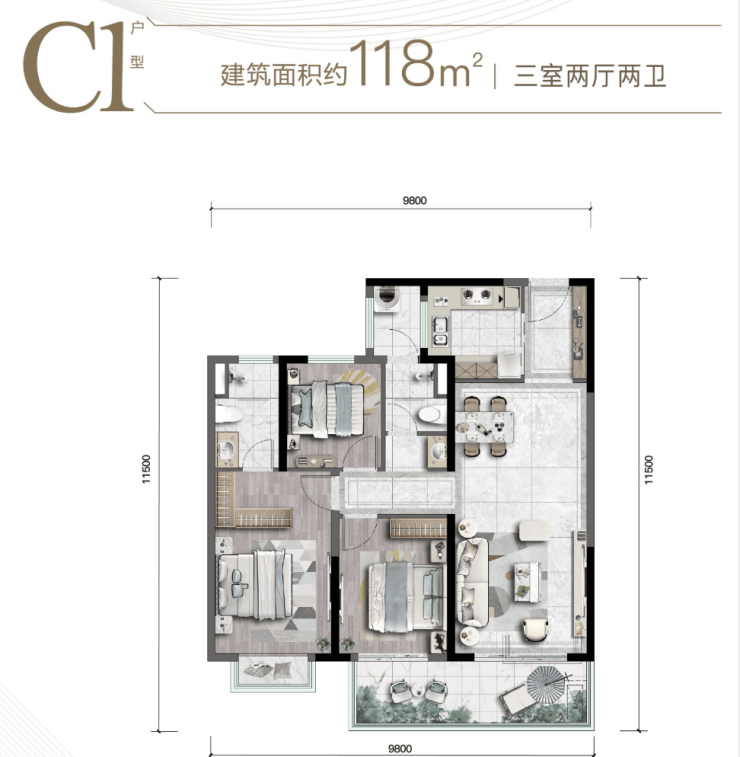 空间升级:双阳台设计、92-102m²X百变可拓展空间、可做功能阳台&卫浴、2.4米入户门(比行业标准高20cm)